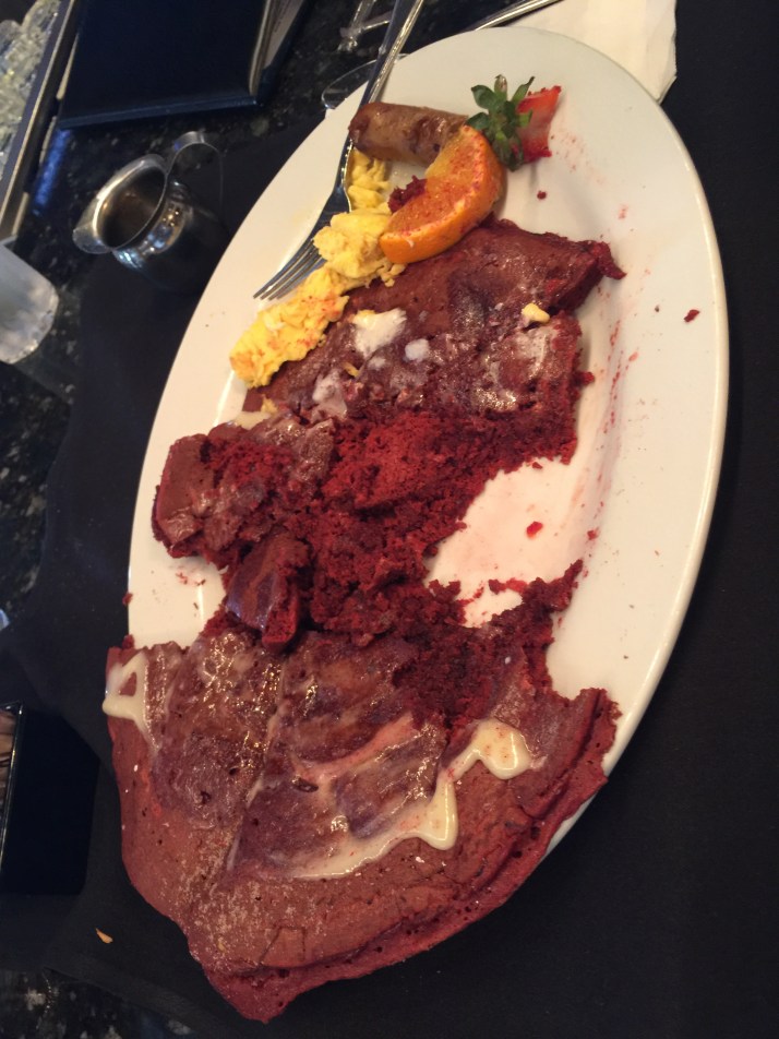 This is a red velvet pancake. Literally, the size of your head!