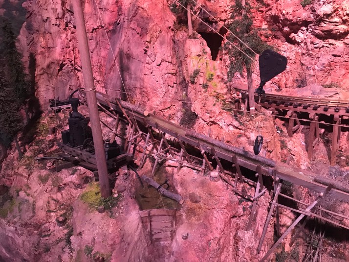 The exhibit starts in Colorado. You first see a logging operation with a man on a one man barge trying to maneuver through the cut aspen trees in a water feature. If you look long enough, it looks like he’s really steering his one man barge.