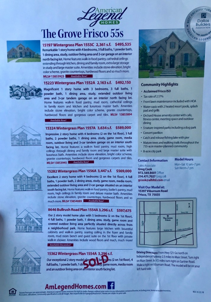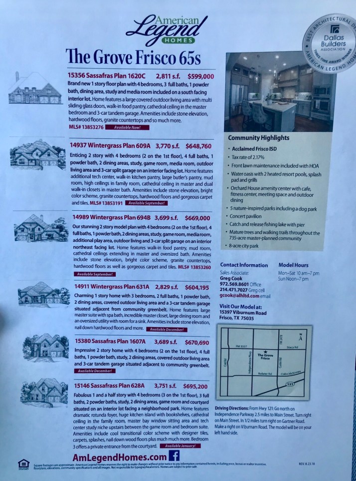 TEXT OR CALL BRAD HOLDEN AT (469)733-2723 TODAY FOR BOTTOM LINE PRICING AT THE GROVE IN FRISCO REGARDING THE BUILDERS AMERICAN LEGEND HOMES, HIGHLAND HOMES OR SOUTHGATE HOMES.