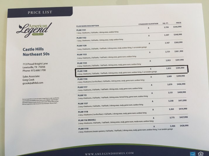All 3 builders are easily in the top 10 for builders in DFW and have been there for a while. Looking at the lot size and each builders prices based on square feet, to me the larger lots at a lower base price seems to be a better deal with American Legend Homes with what they include in their base price.