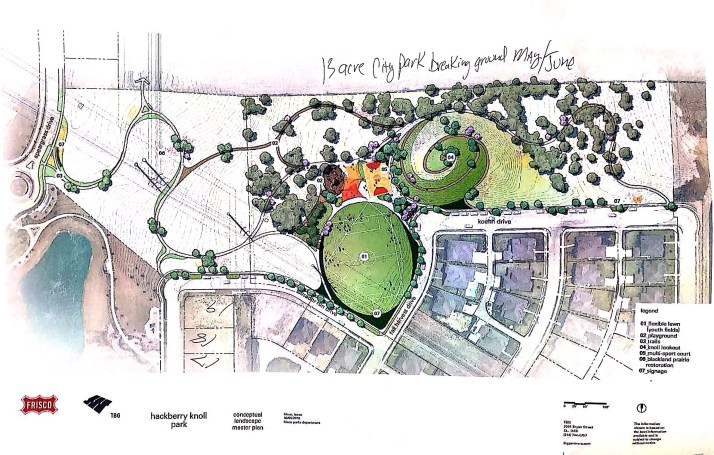 Recently approved by the City of Frisco, Hackberry Knoll Park will be 13 acres of sports fields, a basketball court, kids park and tons of open space!
