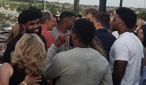 Beside the tables standing Rod Smith, Jeff Heath, Alfred Morris and Ezekiel Elliott were discussing it looks like, Zekes nose ring.
