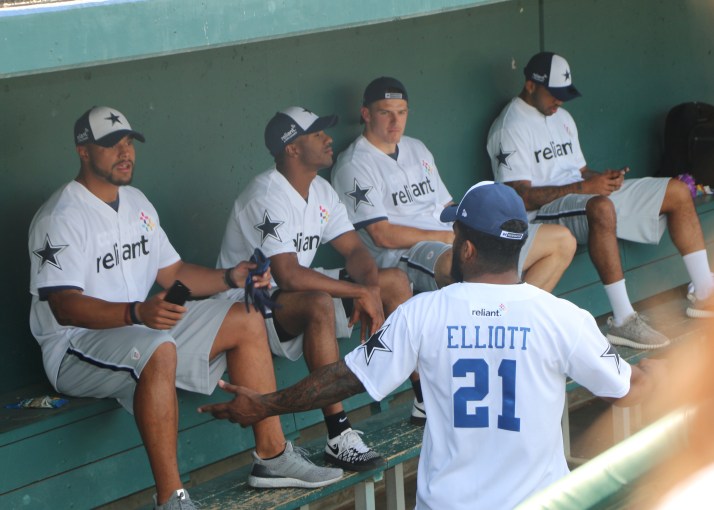 Beside the tables standing Rod Smith, Jeff Heath, Alfred Morris and Ezekiel Elliott were discussing it looks like, Zekes nose ring.