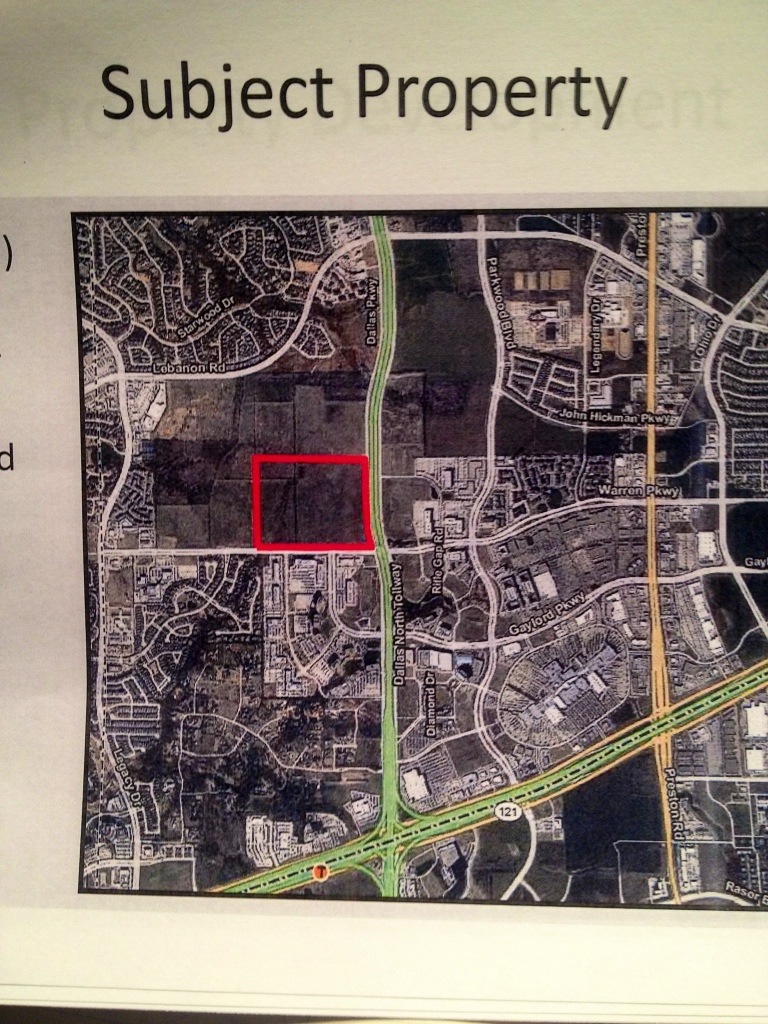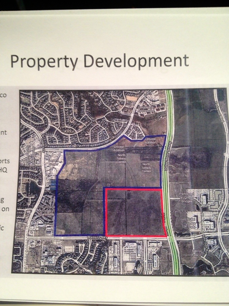The Master Development Agreement that was presented tonight at the special called city council meeting to go over all of the details regarding the plan for the 91.645 acres at the northwest corner of Warren Parkway and the Dallas North Tollroad.