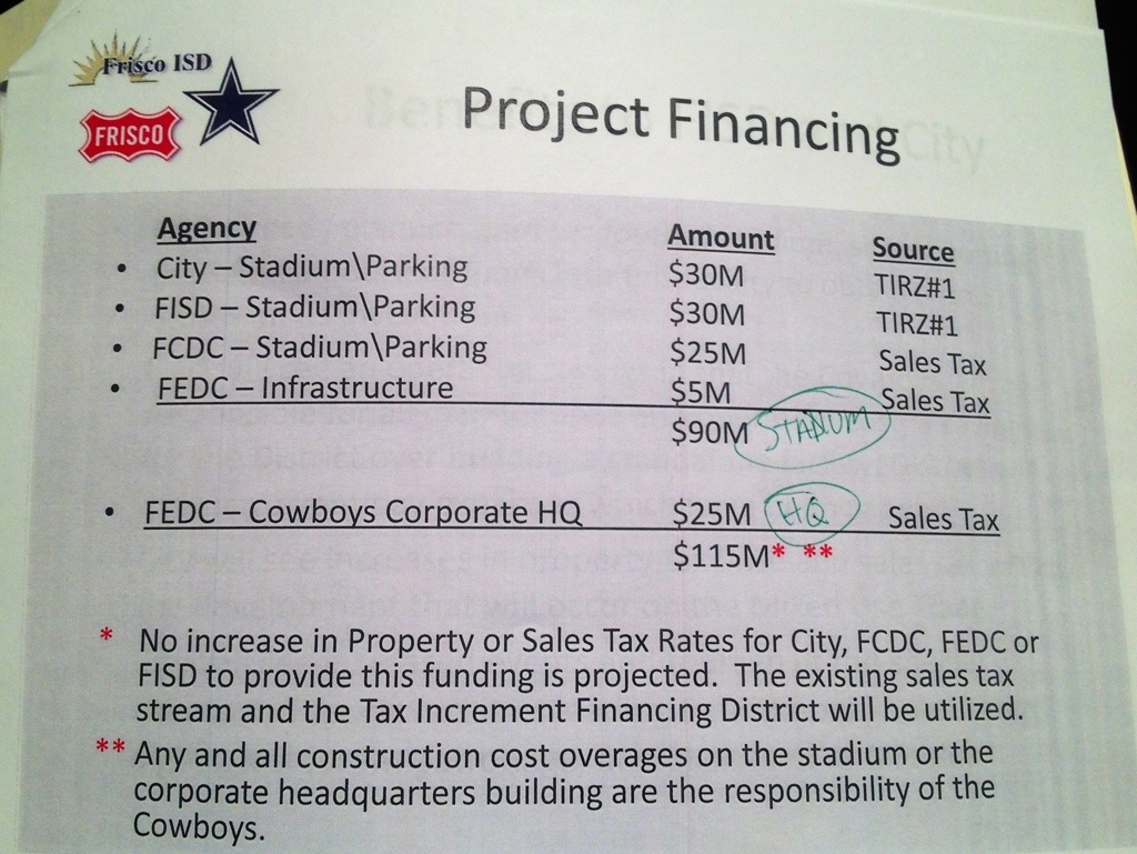 The total that the city of Frisco will be contributing to the Dallas Cowboys deal is around $150 million. Well, if you look at the Frisco economic and development 1 cent tax for 2012, that $150 would most likely only take 7 or 8 or 9 years! Already paid for is my guess!