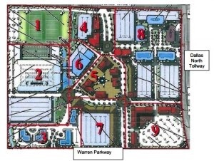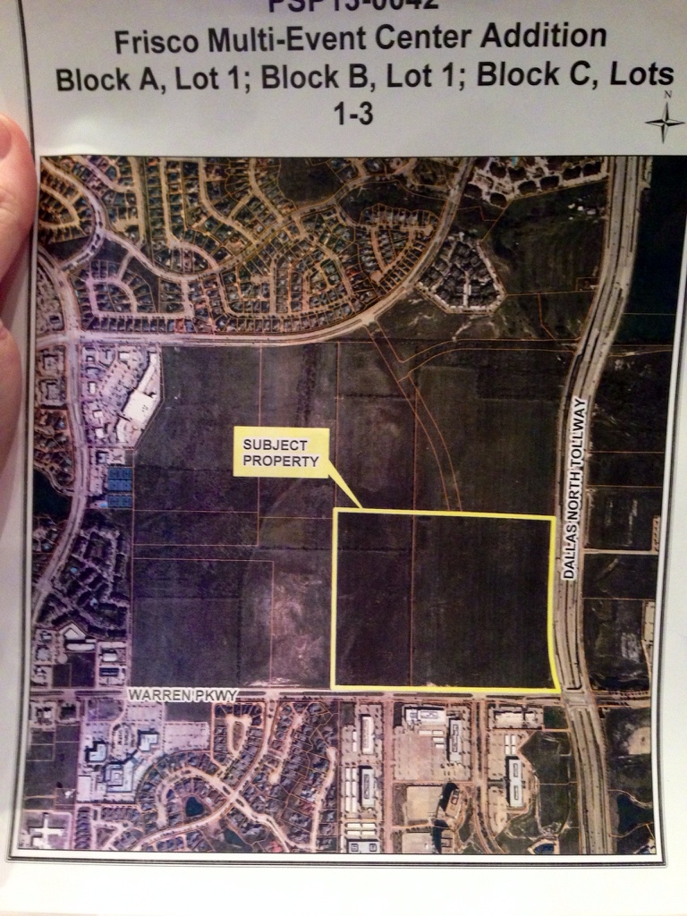 Tonight at the City of Frisco Planning and Zoning Commission meeting at 6:30pm at City Hall the new Dallas Cowboys Training Facility and Headquarters area will be discussed. The 91.6+ acres on the northwest Corner of Warren Parkway will be a Multi-Use Event Center with not only the Cowboys but office space, a hotel, restaurant and multi-use event center development.