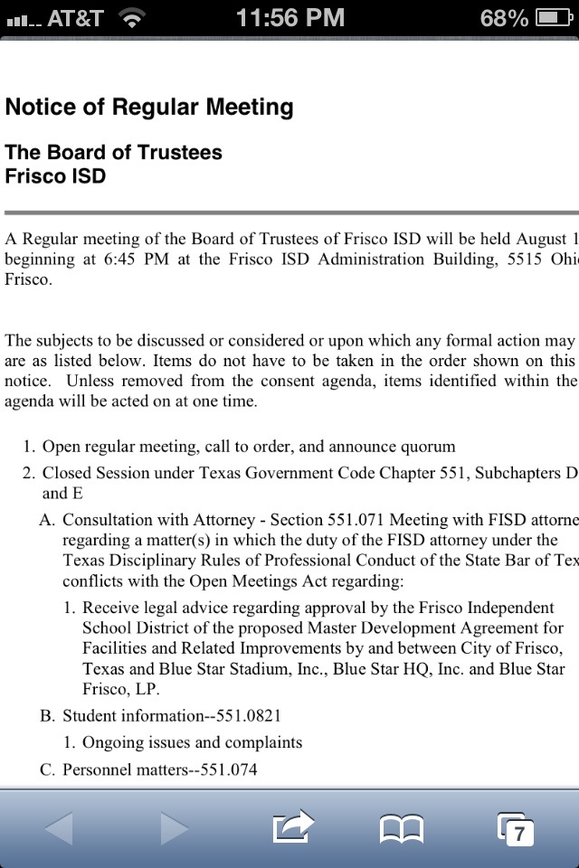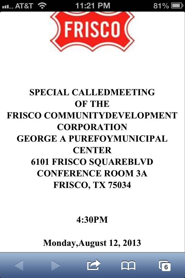 At 4:30pm, first is with the Frisco Community Development Corp. Here the agenda that is set behind closed doors for the FCDC to meet with legal counsel to first discuss the lease, sell or exchange of land at Warren and the North Dallas Tollroad.