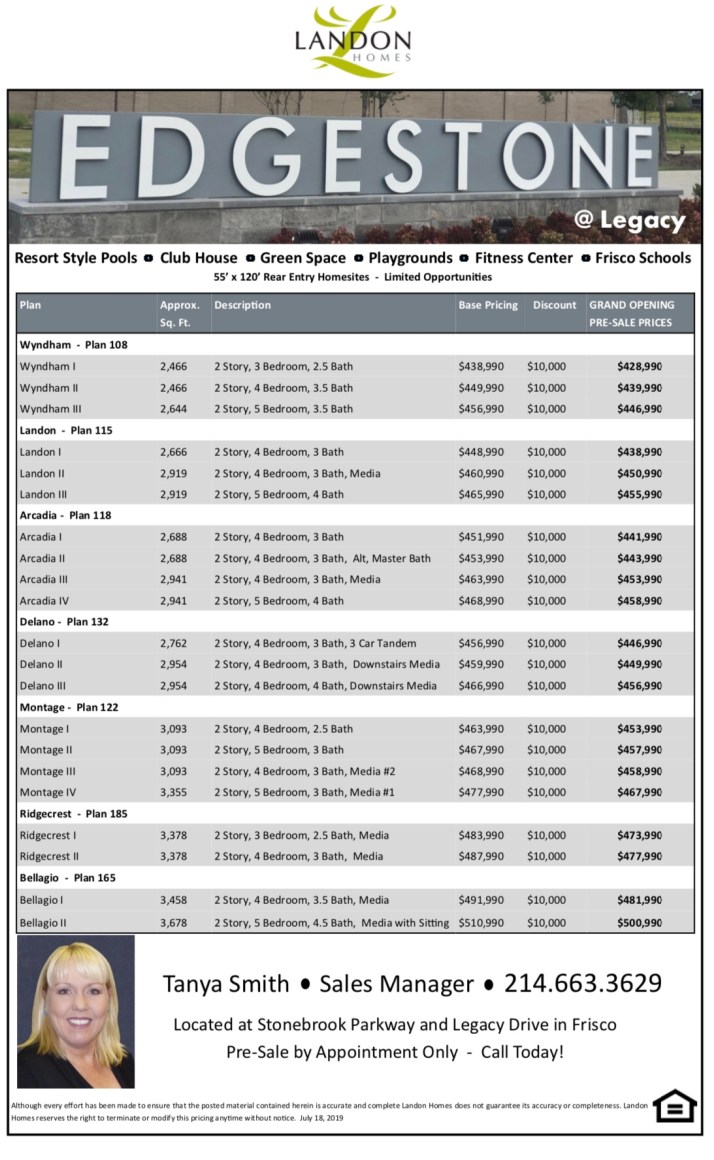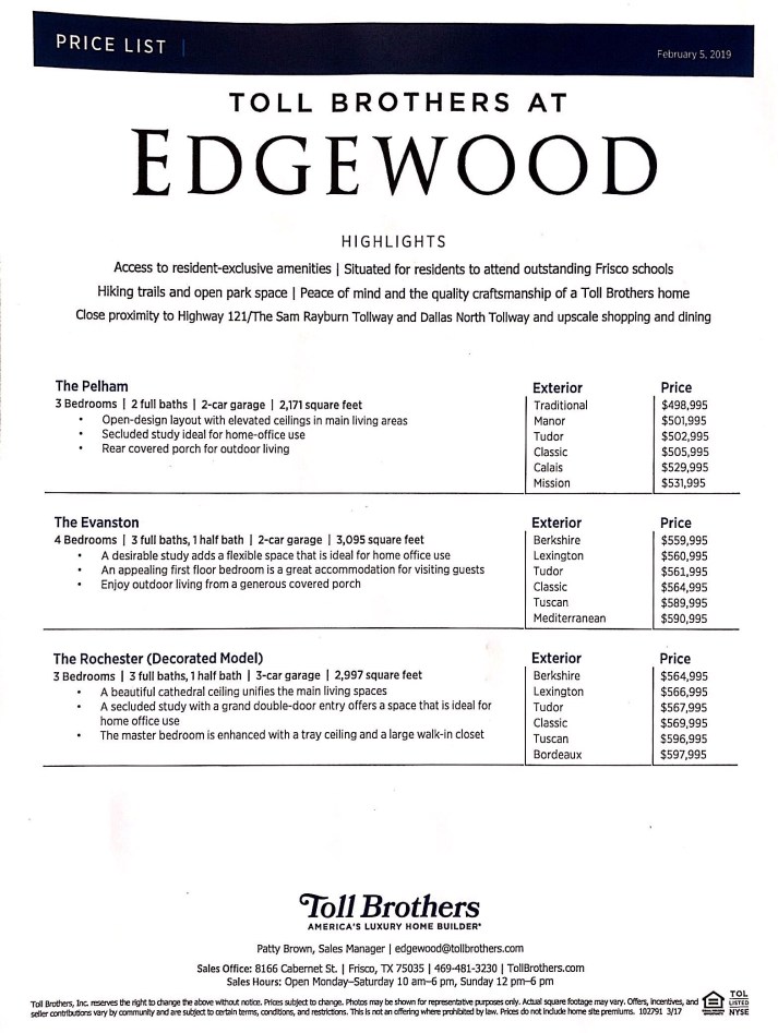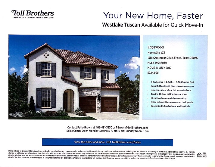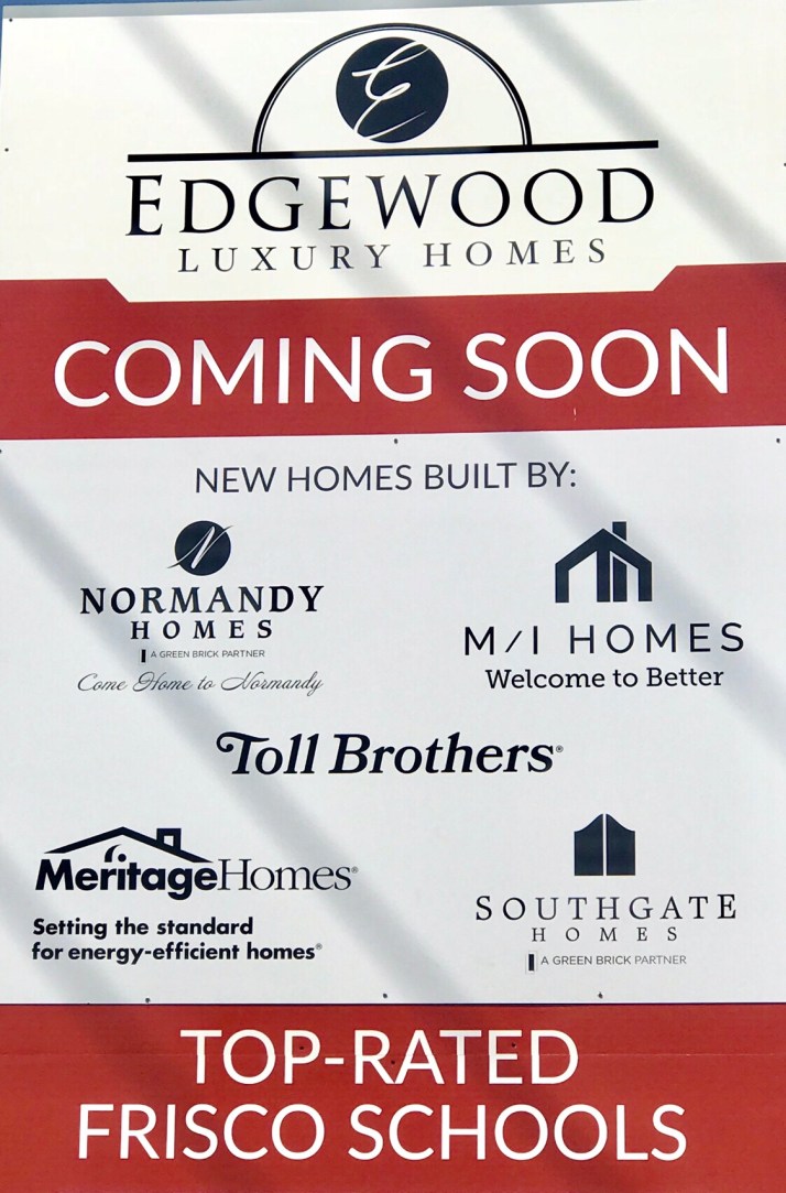 Edgewood in Frisco has been the number 1 selling community for sales in the past 6 months. Currently Toll Brothers, Southgate and Meritage have been the builders but things are a changin’.