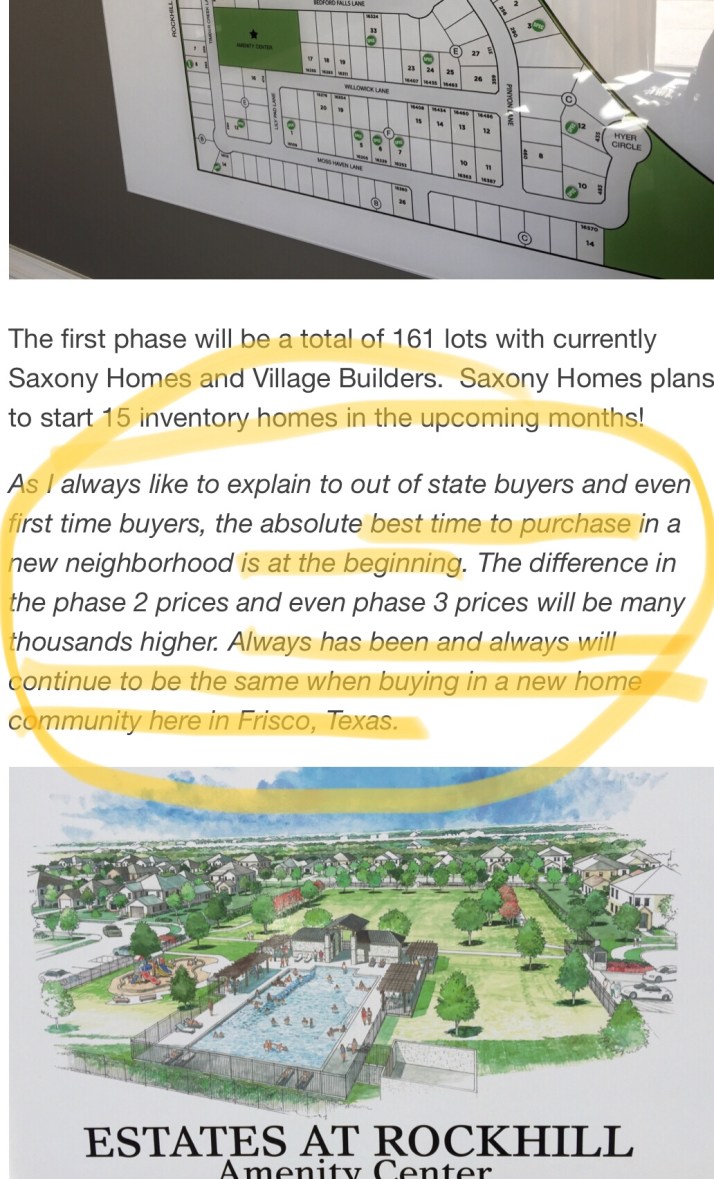 As I always like to explain to out of state buyers and even first time buyers, the absolute best time to purchase in a new neighborhood is at the beginning. The difference in the phase 2 prices and even phase 3 prices will be many thousands higher. Always has been and always will continue to be the same when buying in a new home community here in Frisco, Texas.