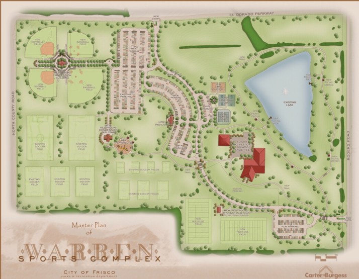 There is a very good amount of open space that I am guessing the City of Frisco required that will help with the overall look and feel. Across the street, there is the massive Warren Sports complex which is around 105 acres filled with every feature you could imagine with an outdoor park, see below.