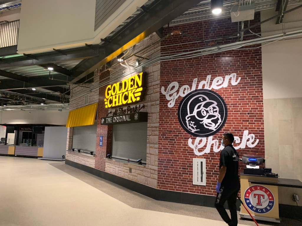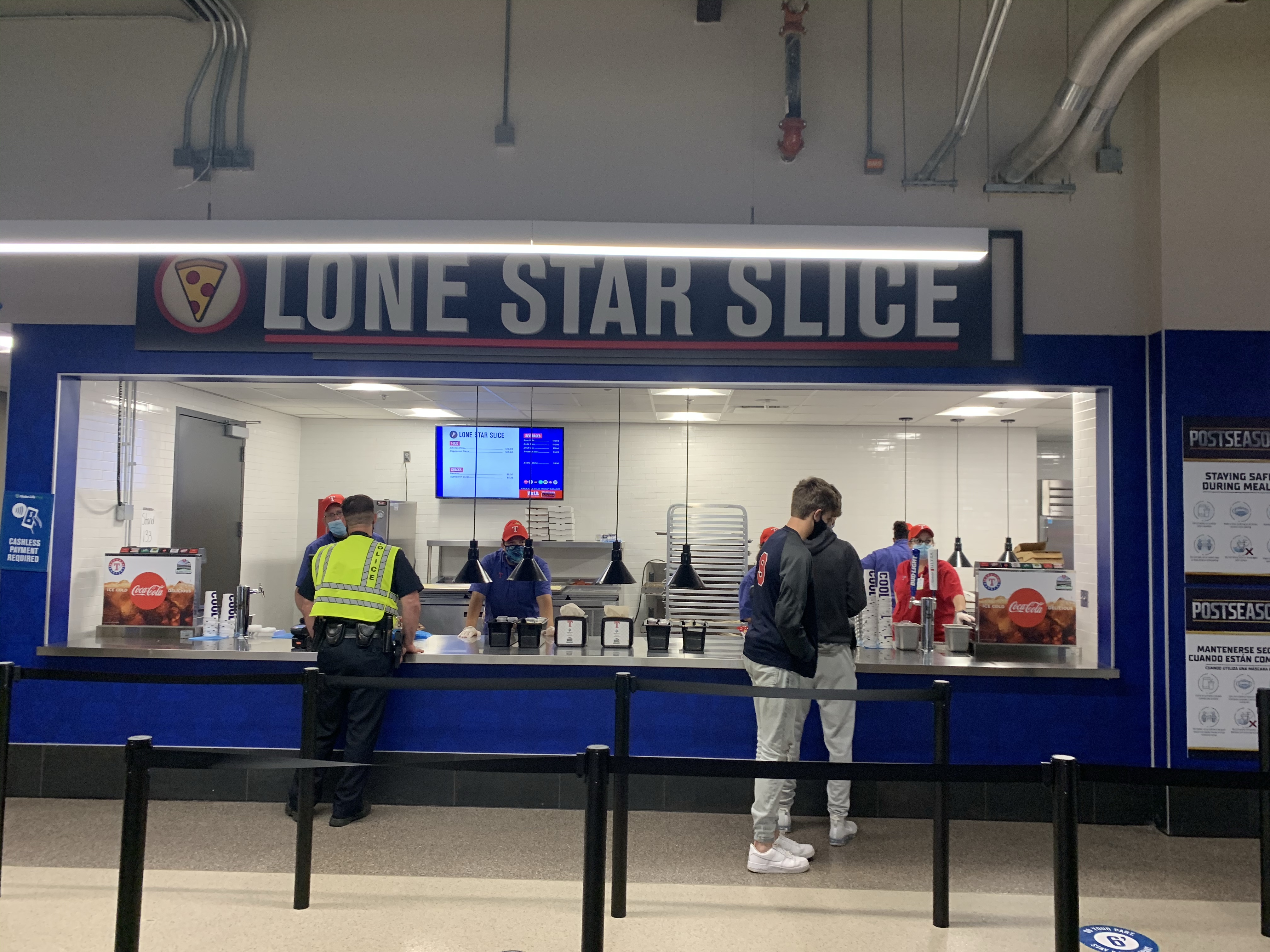Your normal baseball food of hot dogs, crackerjacks, peanuts, footlong hog dogs, nachos were present at Globe Life Field. Adding to the mix was fancy pizzas, Pluckers and a Golden Chick, just to name a few. Variety galore!