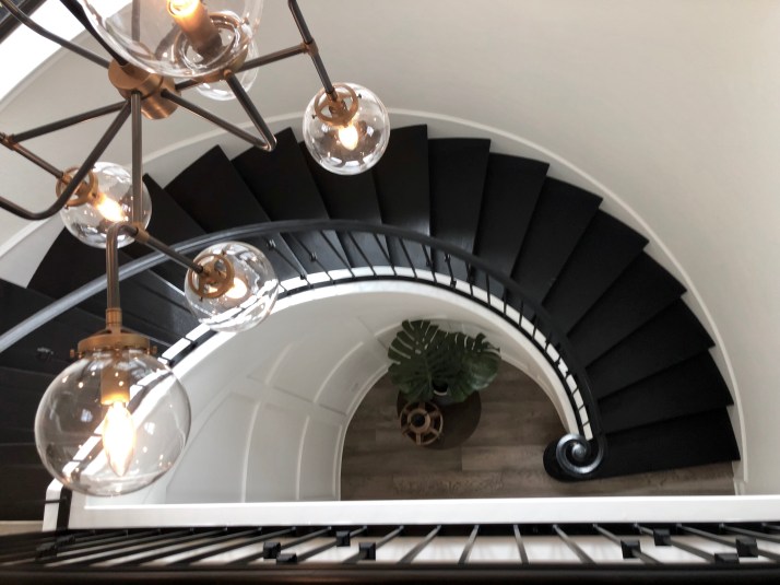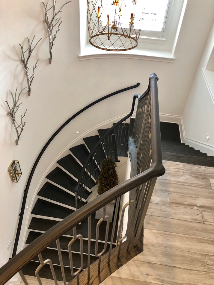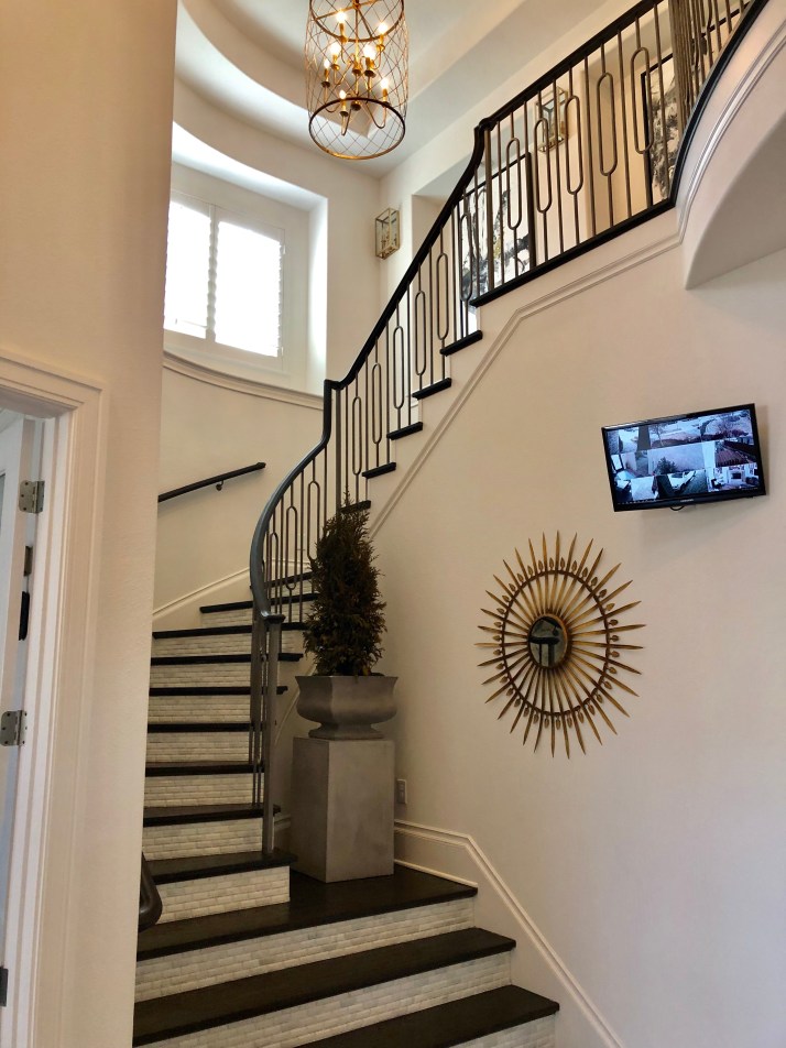Staircase curved with beautiful colors of plates. Something I have never seen was a laundry room like this.