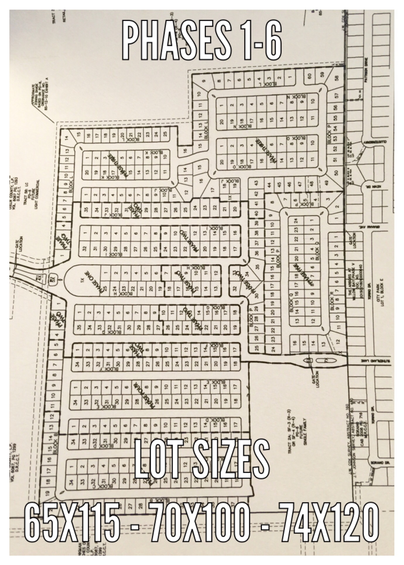 Centrally located, Phases 1-6 will consist of 502 lots and broken into three different standard lot sizes. 140 lots will be in the 65 foot wide by 115 foot deep. 208 lots will be 70 foot wide by 100 foot deep. 154 lots will be 74 foot wide by 120 foot deep. There will always be irregular shaped lots in any community which will not fall within those dimensions.