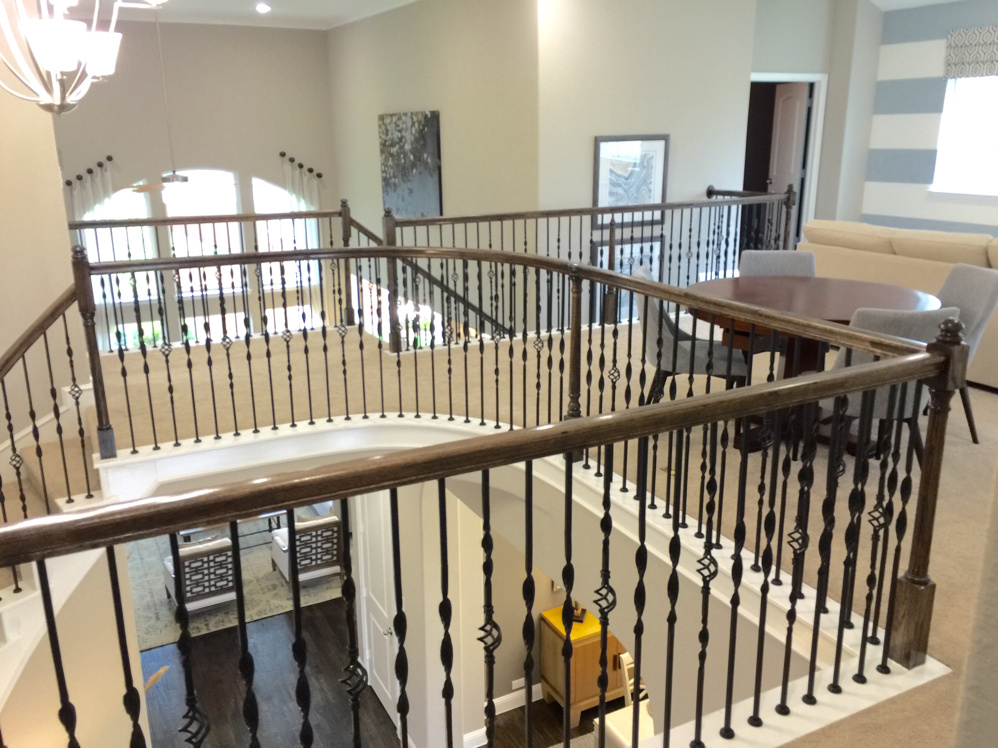 The two story great room is almost 18 feet by 20 with a fireplace in the corner and wall of windows in the back by the patio. Covered Patio is around 17 feet by 9 feet. Powder bath is perfectly placed between the curved staircase and the great room.