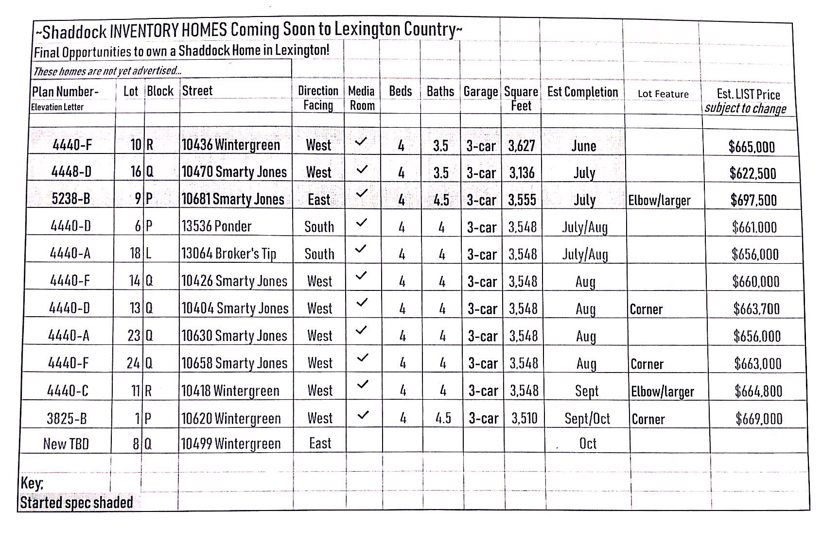 Shaddock Homes at Lexington has 6 available homes ready to go. They range from 2,966 square feet up to 3,973 square feet.