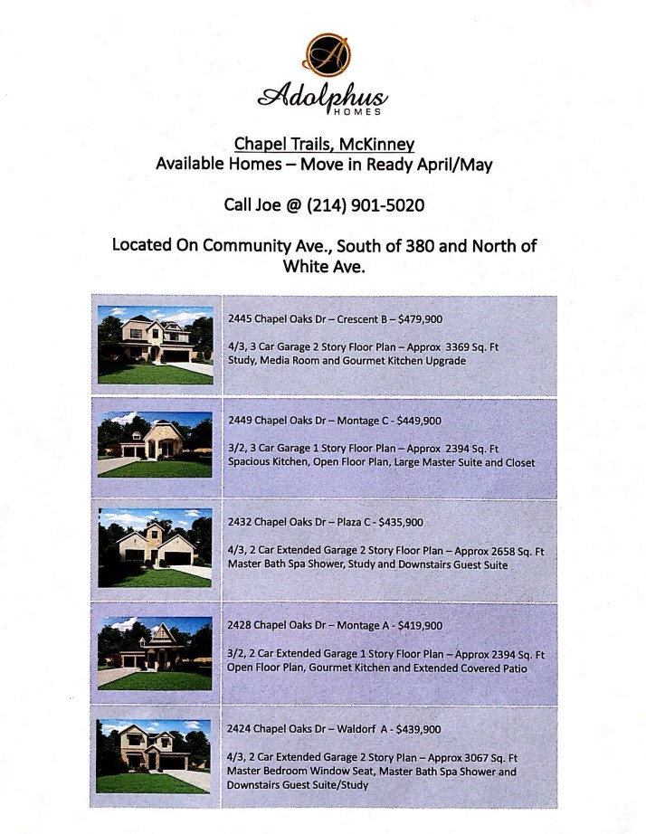 For more on Adolphus Homes at Chapel Trails in McKinney, text or call Brad Holden today at (469)733-2723 for more info and the builders bottom line pricing!