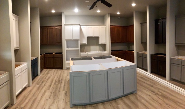 I have never seen above which is located in their second model. This is their selections room, a layout of almost every cabinet offered and will soon have different countertops installed to help new home buyers actually see what they are selecting! Amazing.