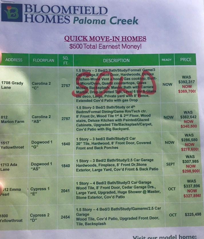 Bloomfield Homes also has two sections where they are filling in empty lots within existing homes. Deals can also be made when builders are in situations like this.