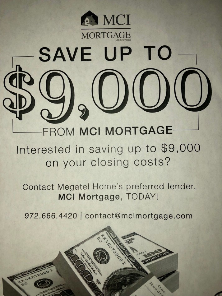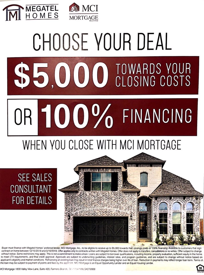 Megatel Homes at Preston Hutson in Frisco has a buyer incentive of 100% financing on any of their homes!