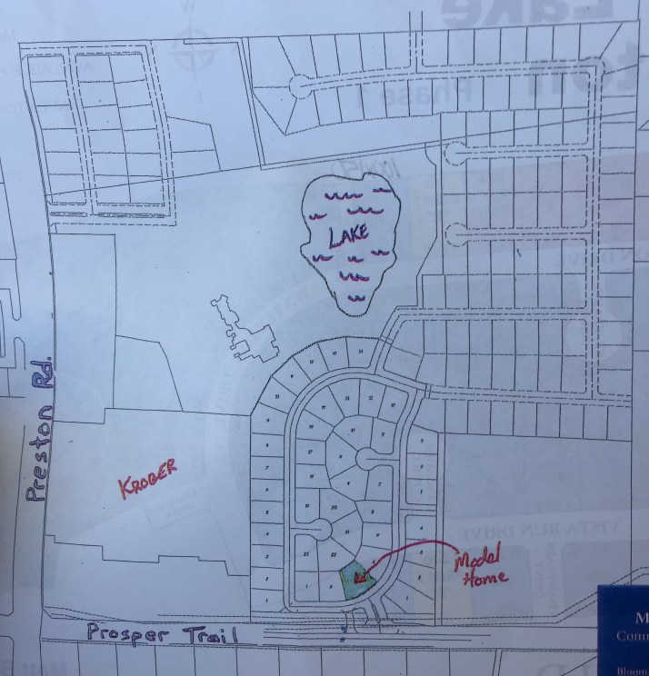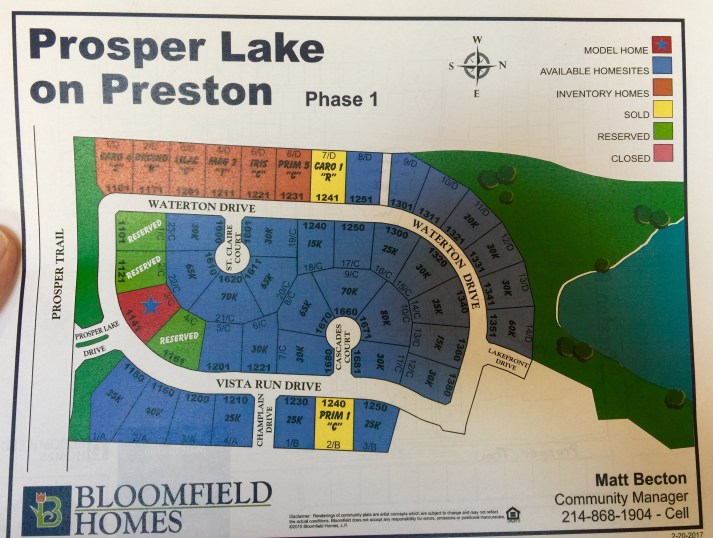 Prosper Lake on Preston is a Bloomfield Homes community. Bloomfield promises the lots will be 1/3 of an acre+. On every lot.