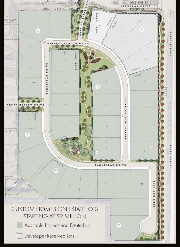 The Homestead at Newman Village is comprised of 33 one acre plus lots for homes ranging from $2,000,000-$5,000,000. They have approved builders like Ron Davis Custom Homes, Northstar Homes, Reynolds Signature, Peckham Builders and Booth Builders.
