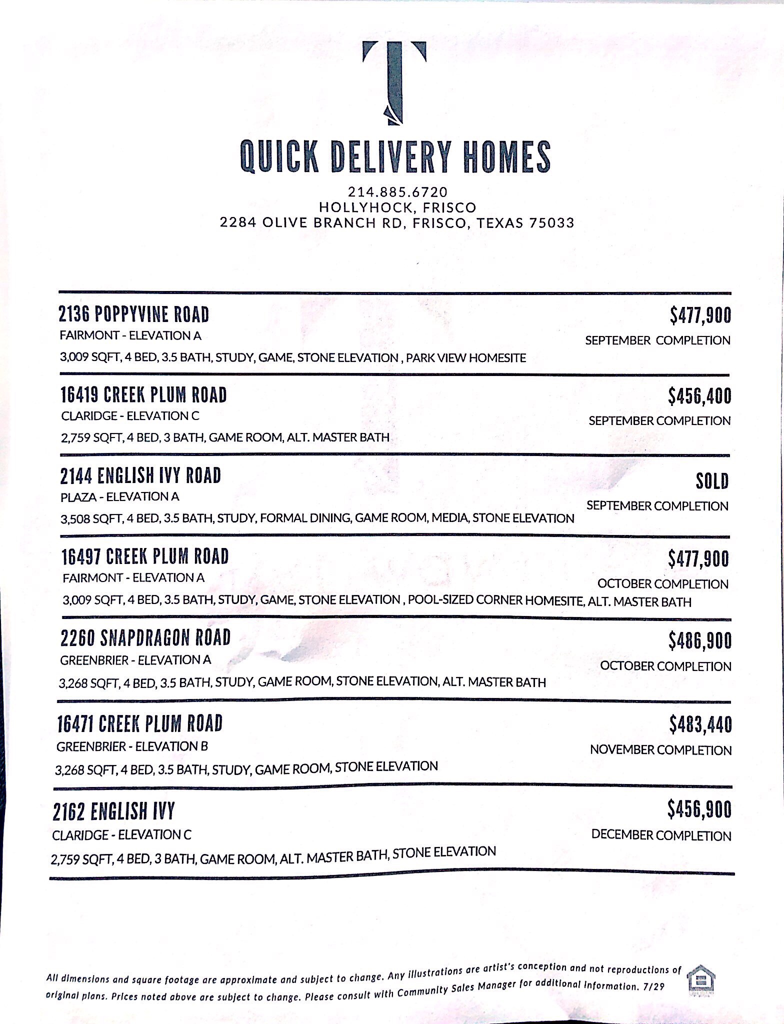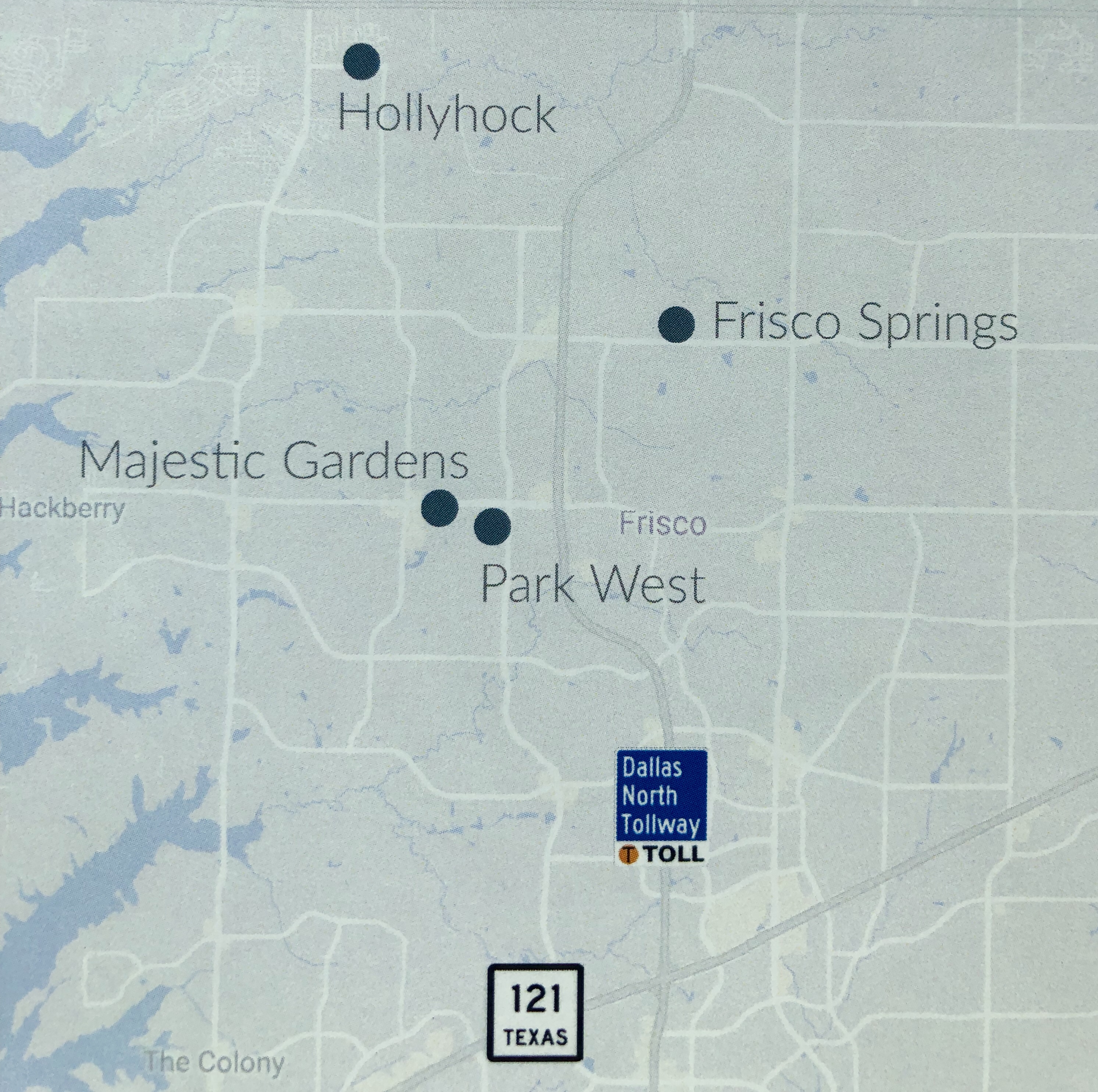 In Frisco, Trophy has 5 neighborhoods they are currently selling homes in. Hollyhock where the PGA is building their headquarters, Frisco Springs, Majestic Gardens, Park West and just announced Edgestone at Legacy and Stonebrook!