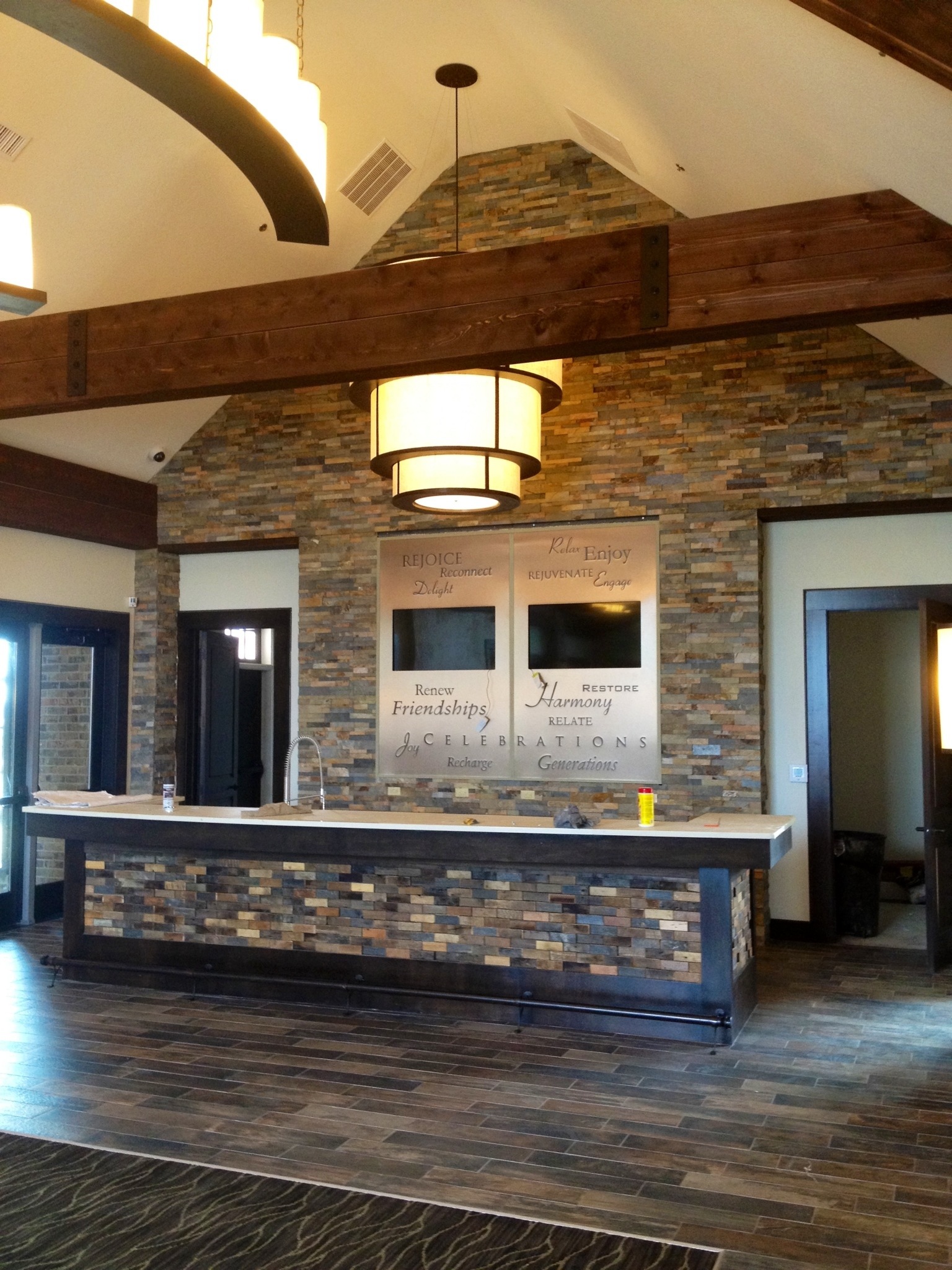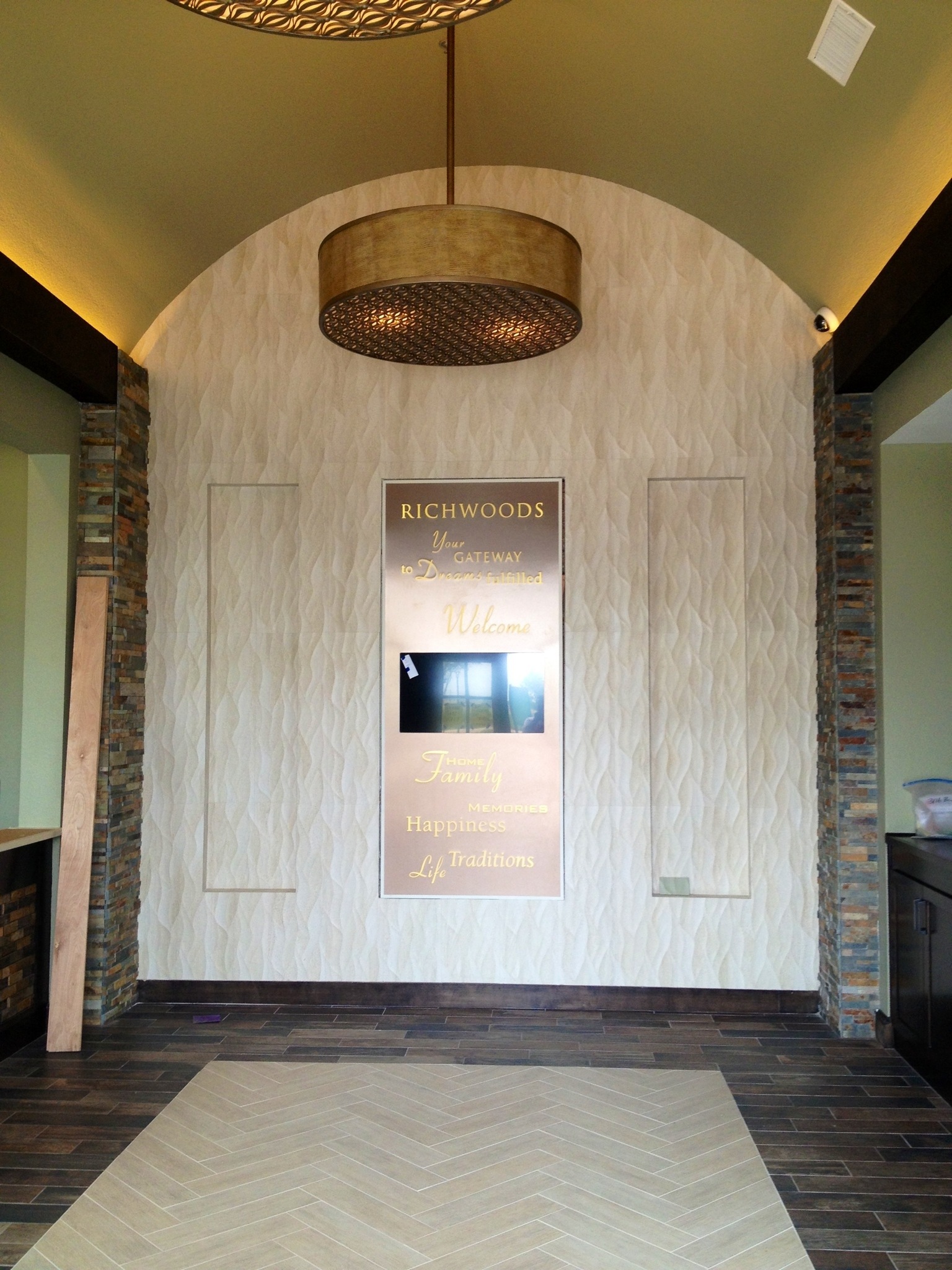 First the entry for Richwoods Amenity center opens to a beautiful foyer with arches and a great combination of tile and stone. There is a flat screen that welcomes you with a large information center to the left about Richwoods.