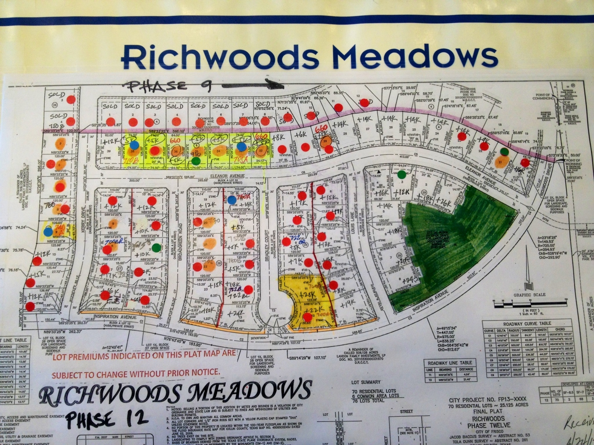 Richwoods Place in Frisco has a total of 200 Lots. Two builders that build here are: K Hovnanian Homes and Landon Homes. A standard size lot is 64 feet wide by 115 feet deep. The next section to be released and have this same product will be called Richwoods Crossing and is planned to open in the next 60 days.