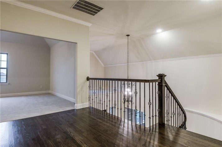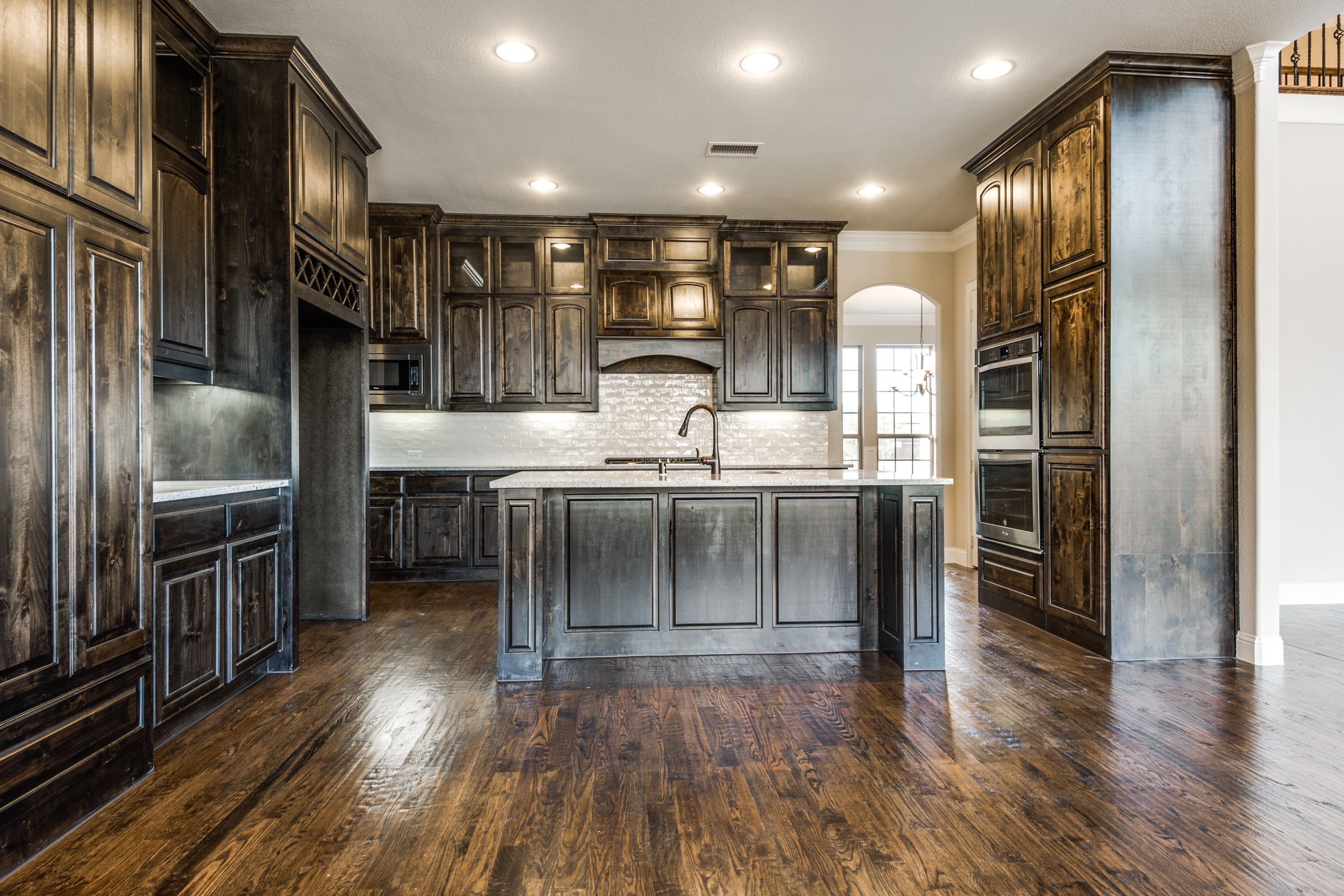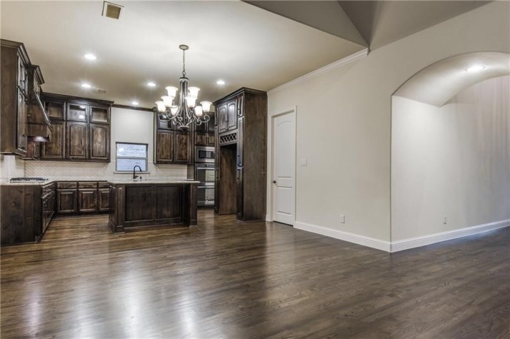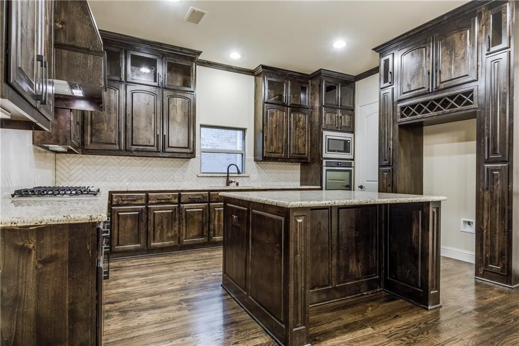 Breathtaking dark stained cabinets in this amazing kitchen that extend to the ceiling, and an oversized island with upgraded thick, rounded granite! Hardwood floors run throughout!
